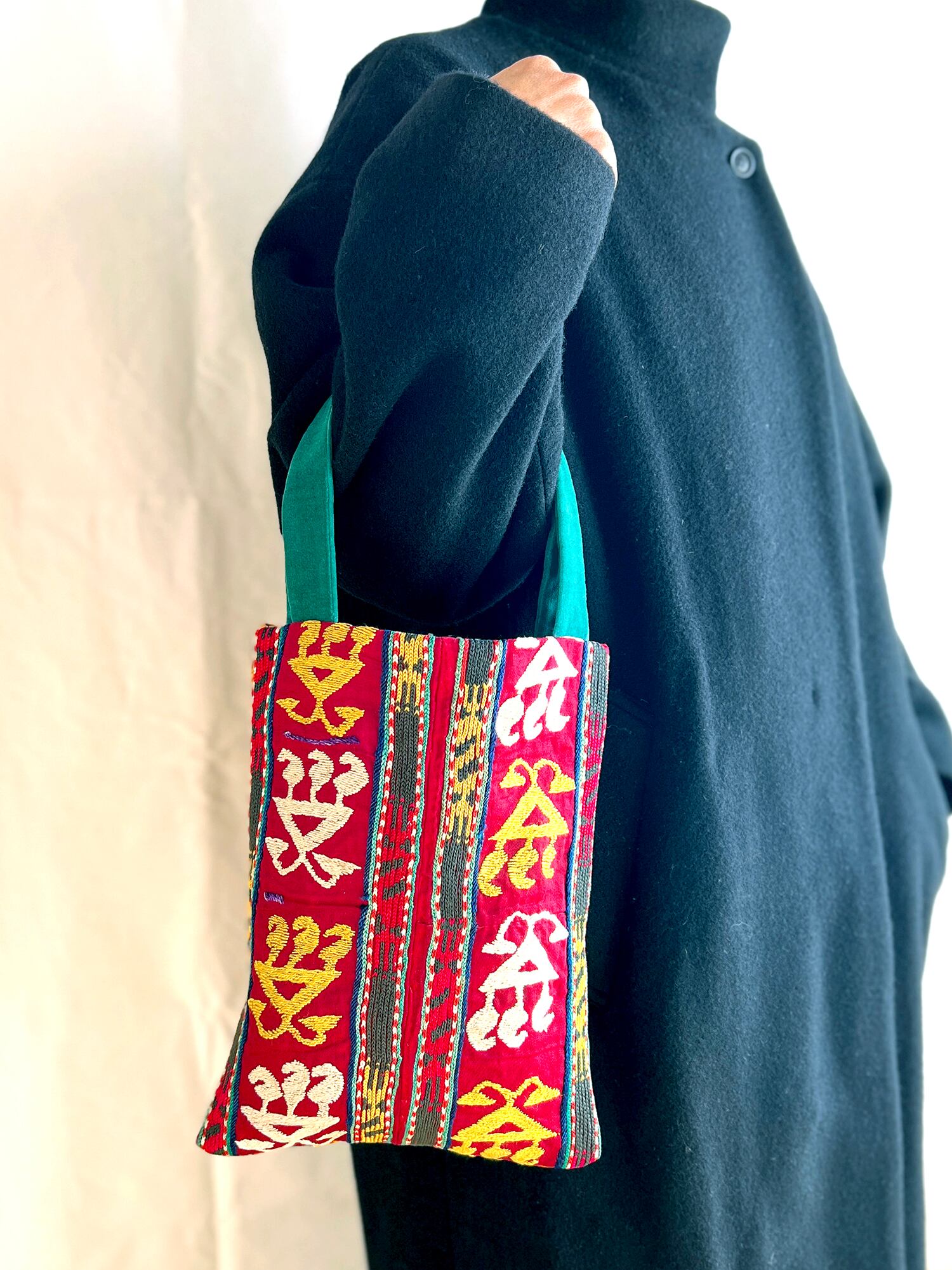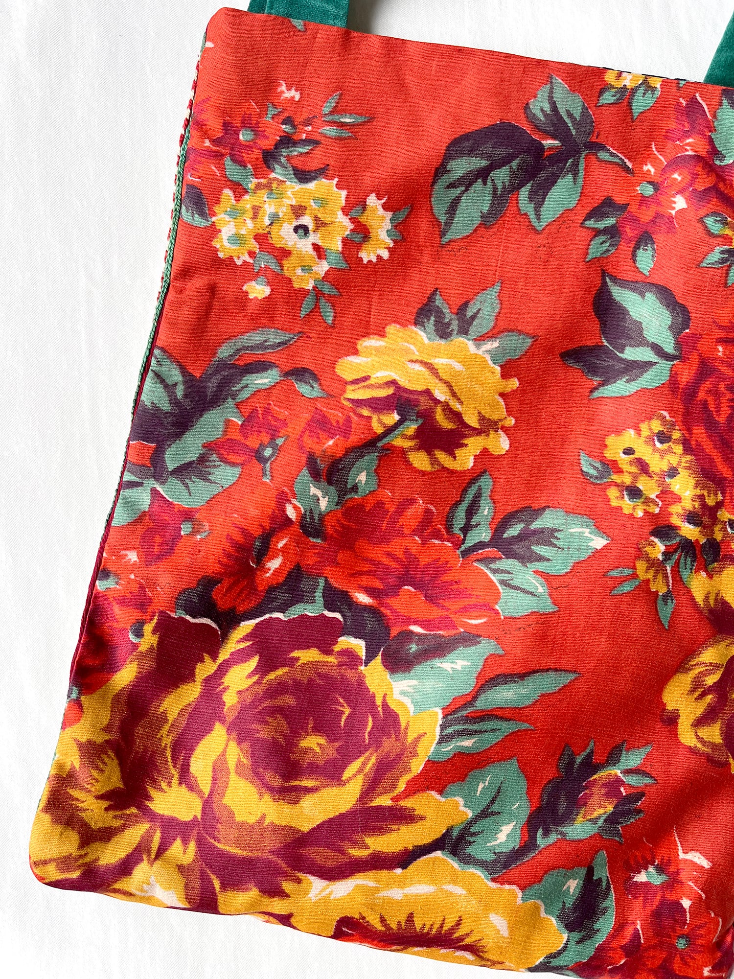 ワインベースコットン生地にほどこされた手刺繍とブレード