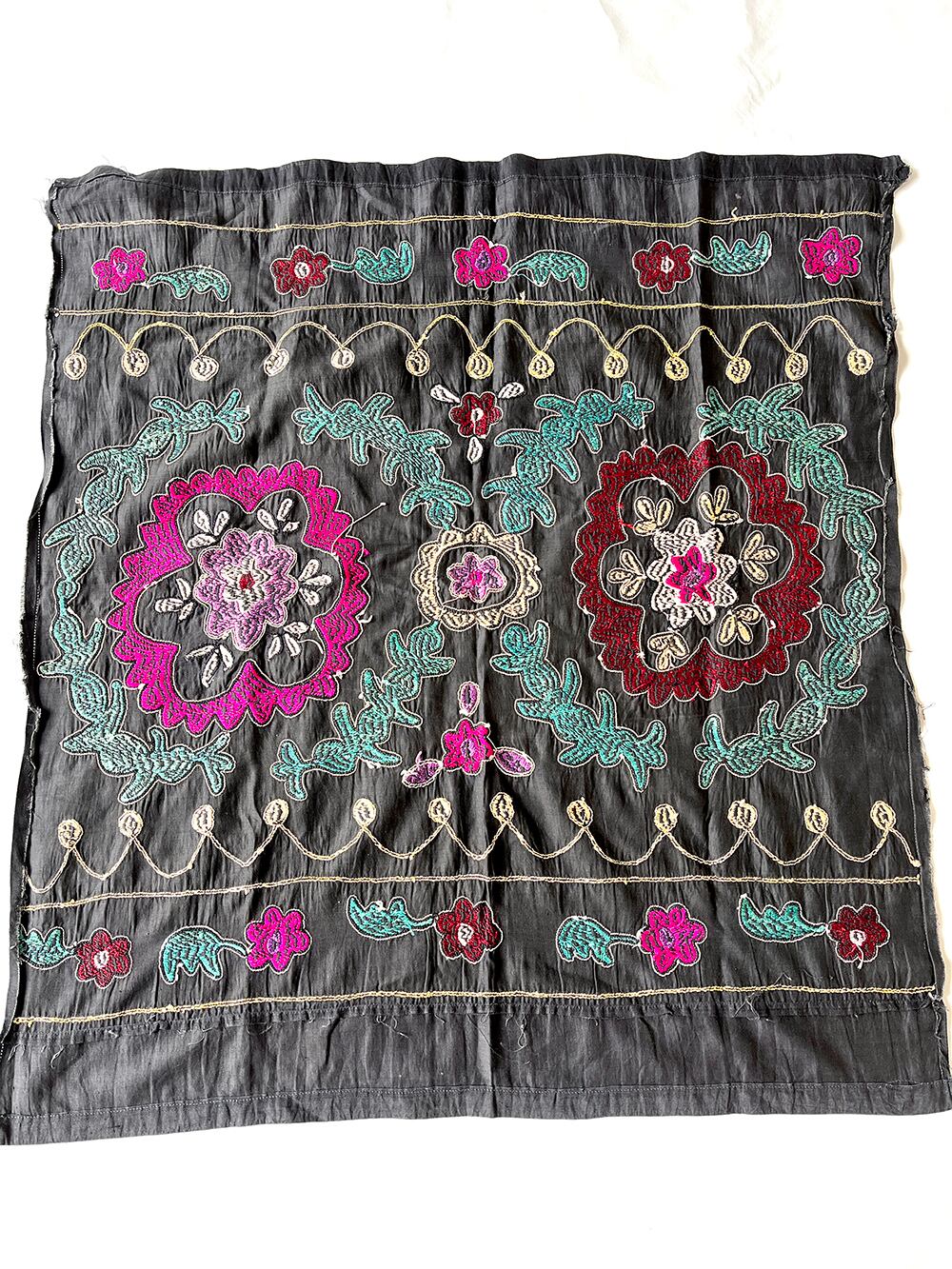 おもにタジキスタン・ウズベキスタン・カザフスタンやそのほかの中央アジアの国々でほどこされた刺繍の布生地のことをさします。昔は婚礼時のに、自分で仕上げた刺繍生地を嫁ぎ先に持っていくために作る風習があったそうです。地域や年代によって色や模様もさまざまで各地の歴史や古い風習を物語っています。手作りの刺繍のあたたかみと埋め尽くされた独特なシルク糸の色合いそして模様は伝統・デザイン・そして生活に根付いていた美しい民芸のひとつだと思います。