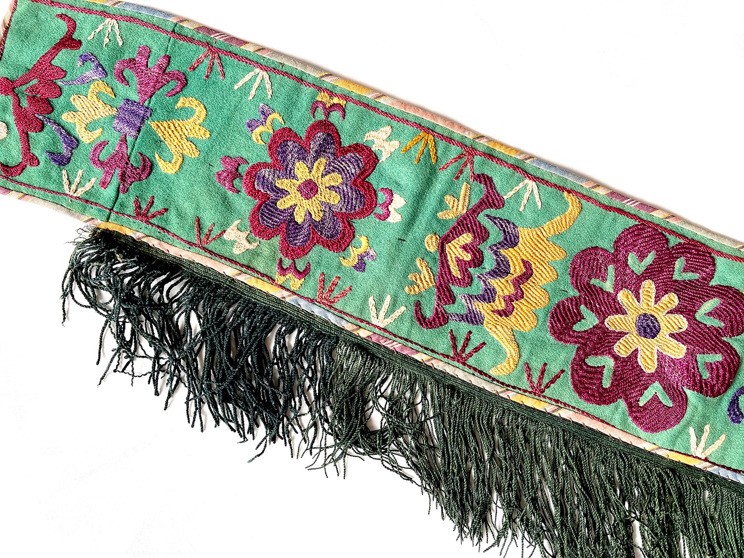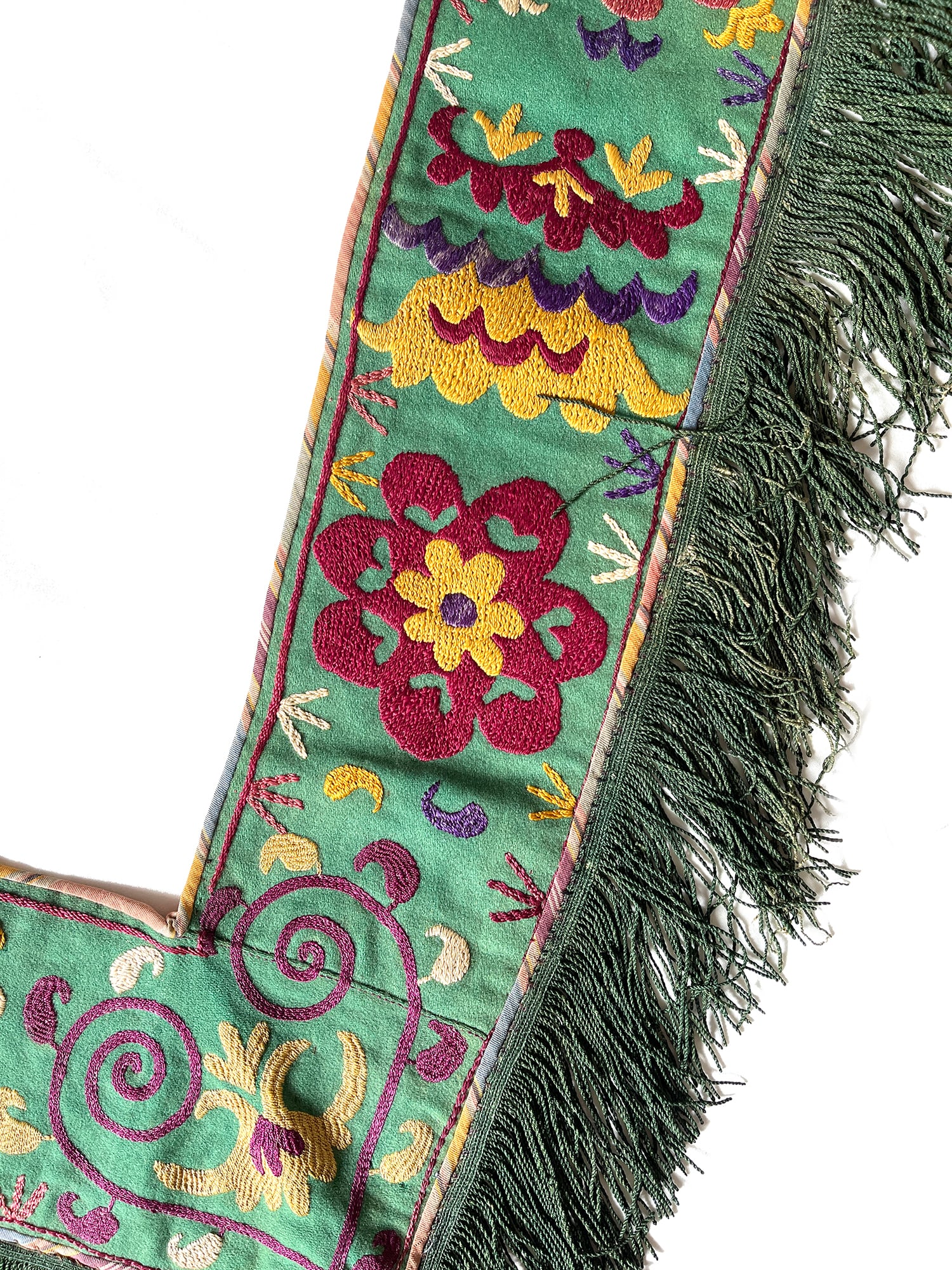 おもにタジキスタン・ウズベキスタン・カザフスタンやそのほかの中央アジアの国々でほどこされた刺繍の布生地のことをさします。昔は婚礼時のに、自分で仕上げた刺繍生地を嫁ぎ先に持っていくために作る風習があったそうです。地域や年代によって色や模様もさまざまで各地の歴史や古い風習を物語っています。手作りの刺繍のあたたかみと埋め尽くされた独特なシルク糸の色合いそして模様は伝統・デザイン・そして生活に根付いていた美しい民芸のひとつだと思います。