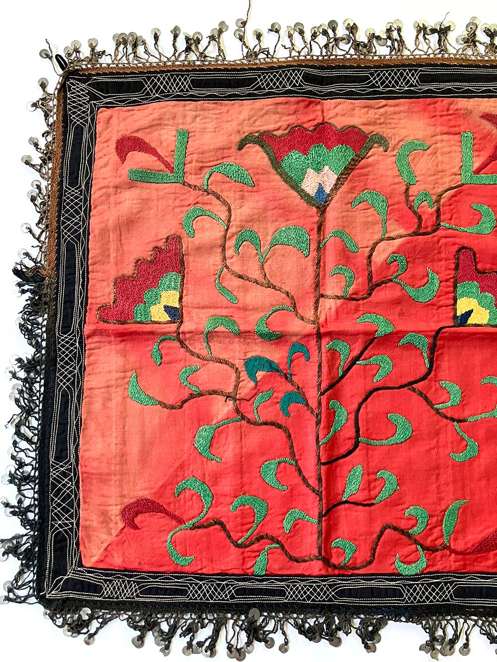 おもにタジキスタン・ウズベキスタン・カザフスタンやそのほかの中央アジアの国々でほどこされた刺繍の布生地のことをさします。昔は婚礼時のに、自分で仕上げた刺繍生地を嫁ぎ先に持っていくために作る風習があったそうです。地域や年代によって色や模様もさまざまで各地の歴史や古い風習を物語っています。手作りの刺繍のあたたかみと埋め尽くされた独特なシルク糸の色合いそして模様は伝統・デザイン・そして生活に根付いていた美しい民芸のひとつだと思います。