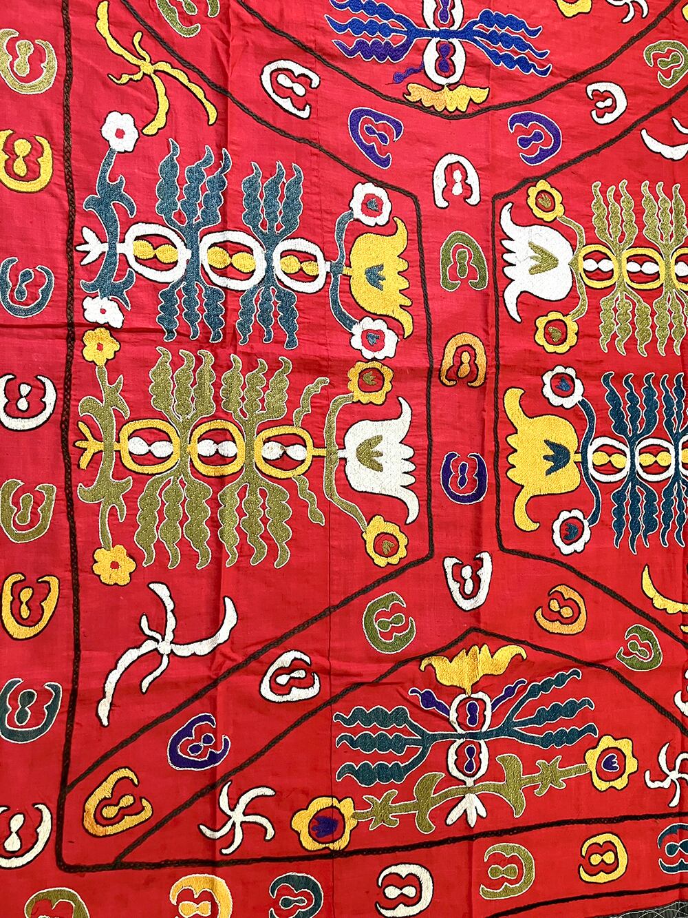 おもにタジキスタン・ウズベキスタン・カザフスタンやそのほかの中央アジアの国々でほどこされた刺繍の布生地のことをさします。昔は婚礼時のに、自分で仕上げた刺繍生地を嫁ぎ先に持っていくために作る風習があったそうです。地域や年代によって色や模様もさまざまで各地の歴史や古い風習を物語っています。手作りの刺繍のあたたかみと埋め尽くされた独特なシルク糸の色合いそして模様は伝統・デザイン・そして生活に根付いていた美しい民芸のひとつだと思います。